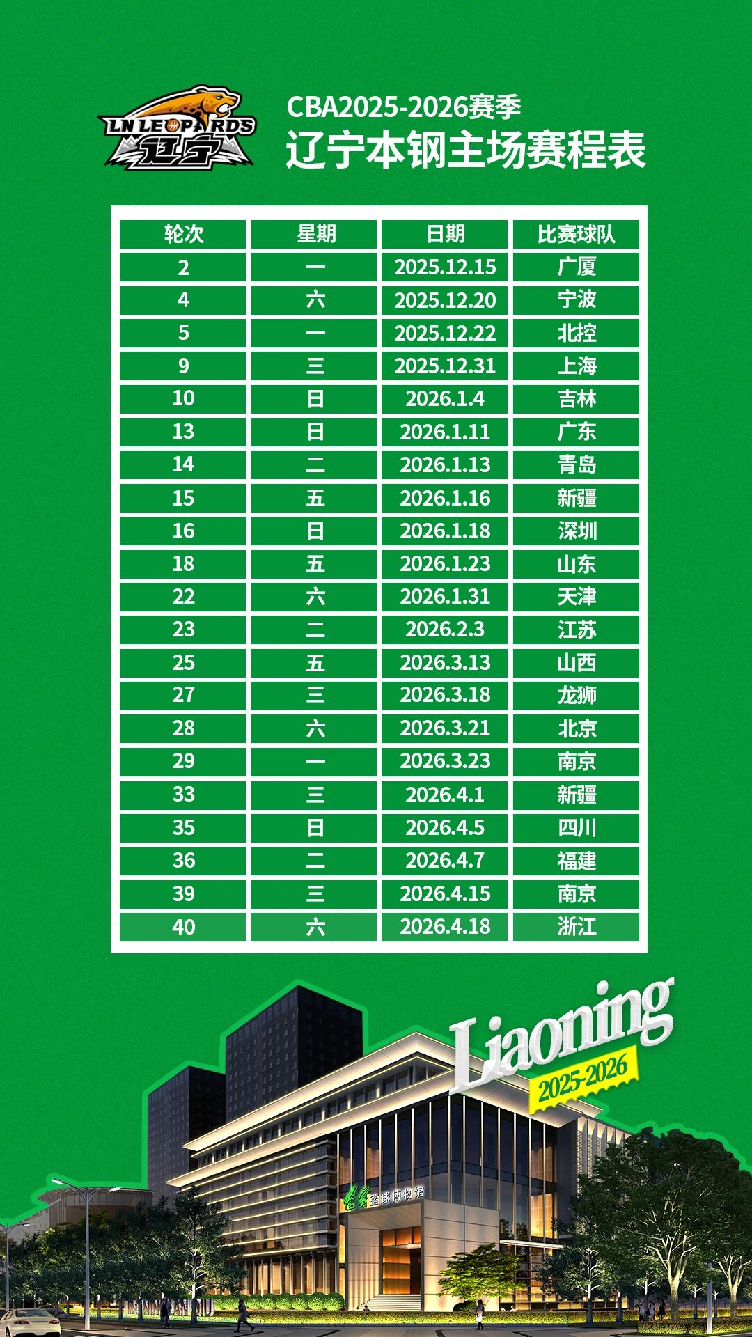 在CBA版图中,辽宁本钢男篮的主场始终是联盟最具人气的“魔鬼主场”之一。2025-2026赛季,辽宁男篮将继续为球迷奉献20场常规赛主场对决,赛程从2025年12月15日持续至2026年4月15日,每晚19:35准时点燃篮球激情。“看辽篮比赛,游沈阳景点”成为新的文旅热点。赛场内外,辽宁文化元素随处可见,让全国球迷在感受篮球激情的同时,领略辽宁的独特魅力。