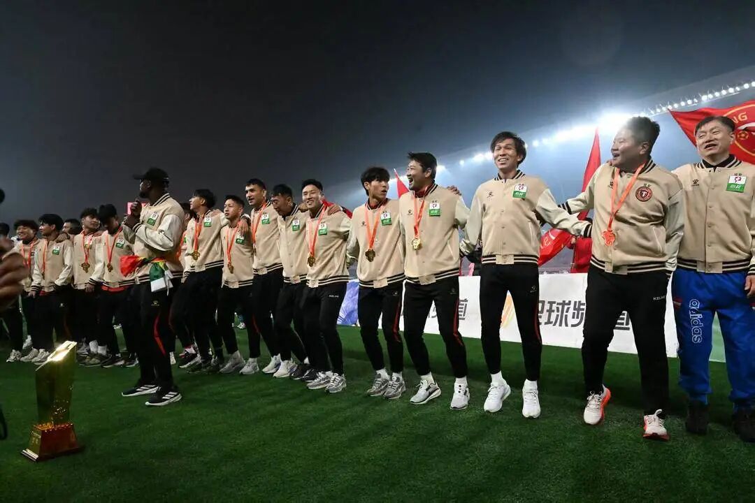 比赛结束后,中甲联赛冠军颁奖典礼在铁西体育场举行。在全场球迷的欢呼声中,主教练李金羽和队长邦本宜裕共同将冠军奖杯举过头顶。这是2019年获得中乙联赛冠军之后,铁人队队史的第二座冠军奖杯。